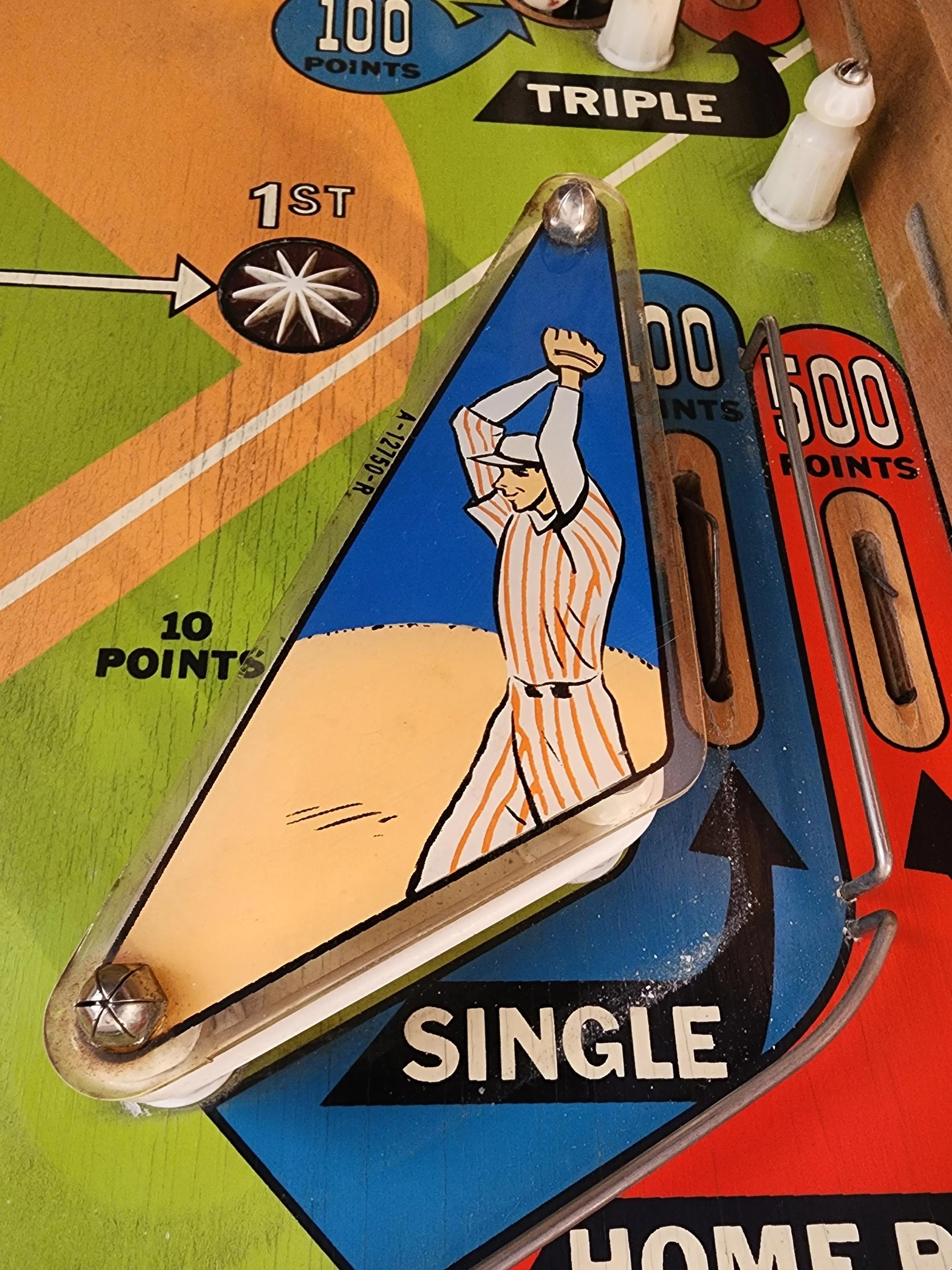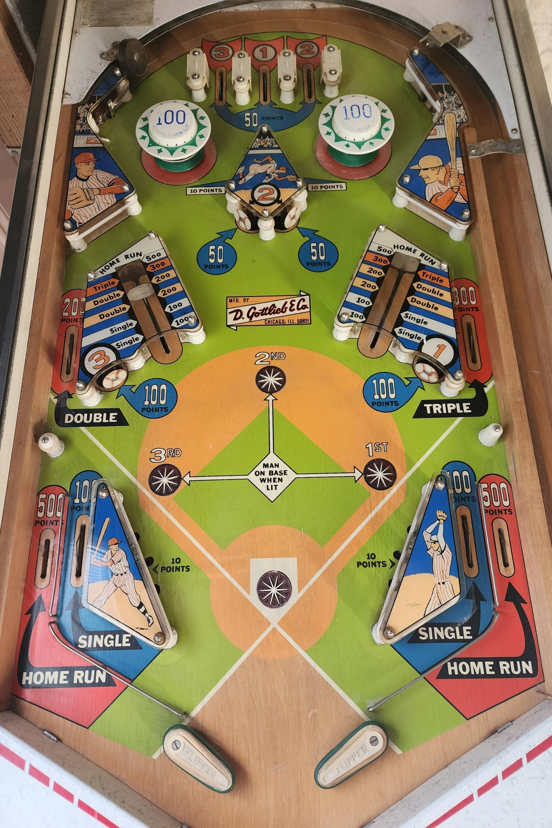 Vintage baseball-themed pinball machine with artwork of baseball players and scoring zones.