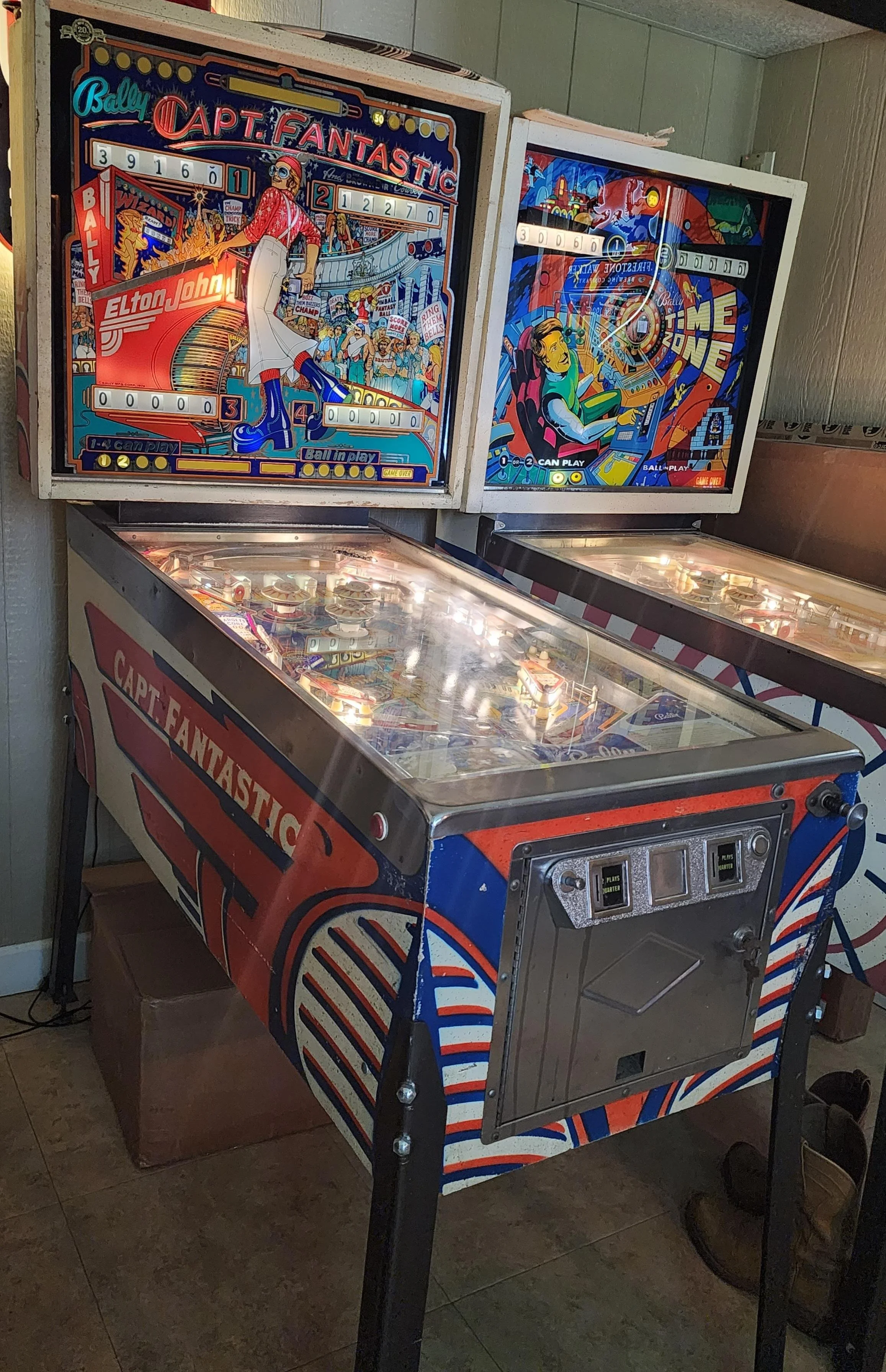 Vintage Bally Captain Fantastic pinball machine with colorful artwork and lighting, featuring a woman in red and white boots on the back glass, in a dimly lit room.