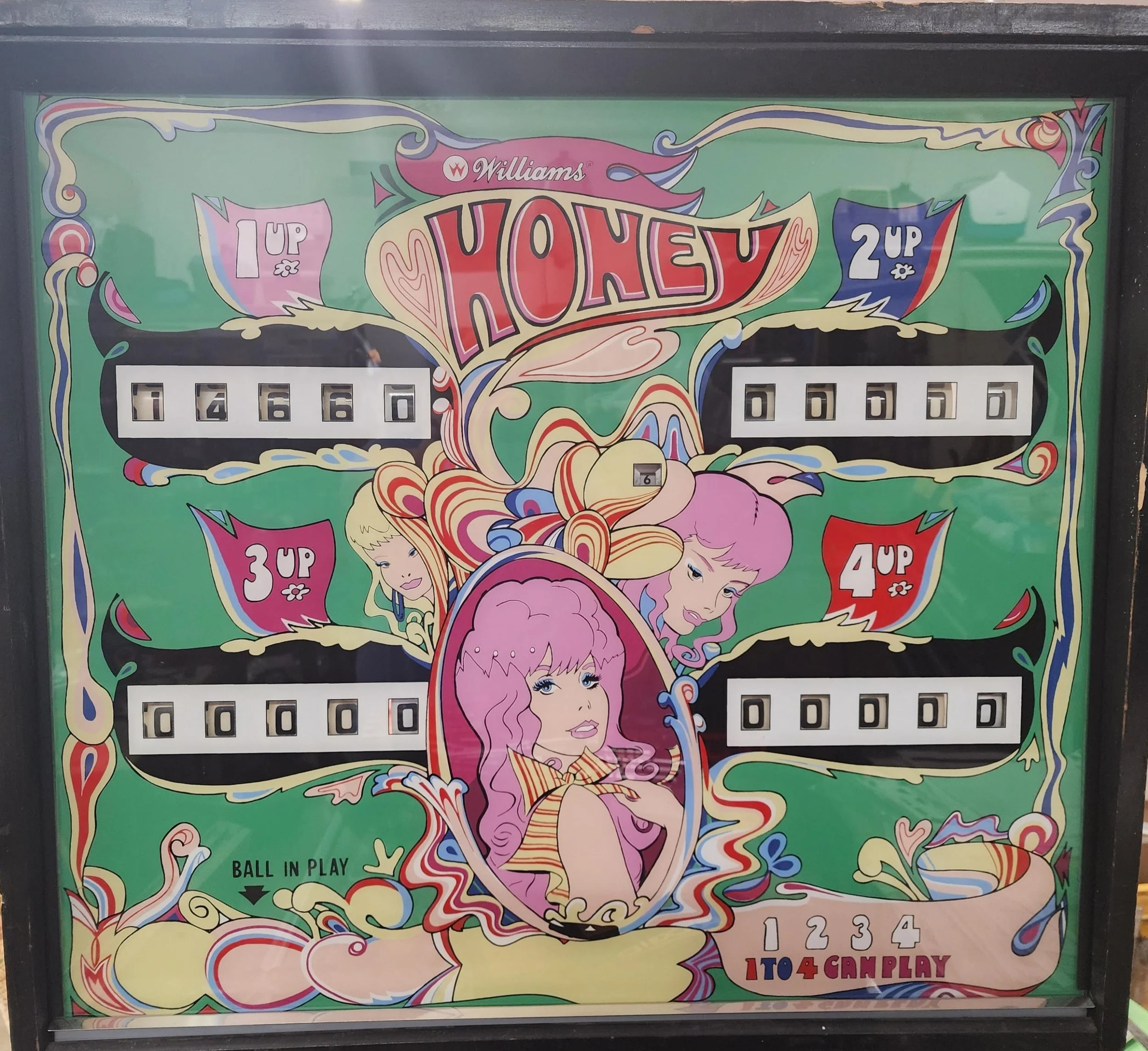 Vintage Williams Honey pinball machine with colorful, psychedelic art featuring four women, including one with pink hair in the center, and various score displays and game instructions.