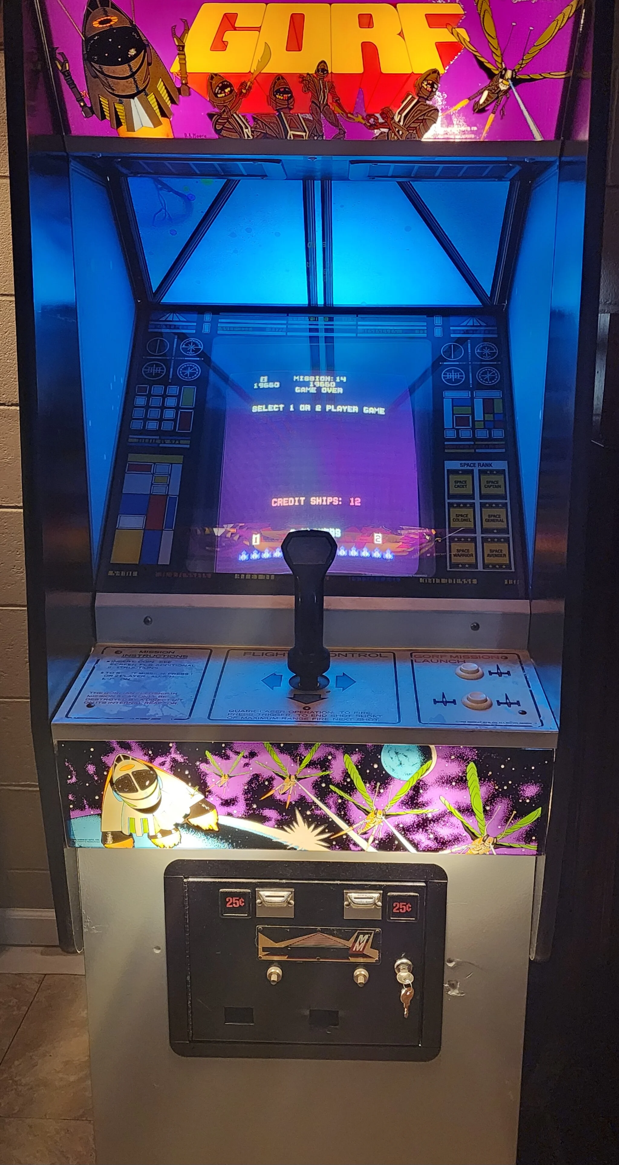 An arcade game machine called Gorf, a classic space shooter game, with a space-themed illustration on the top and side panels. The game screen displays a game over message with high score details, and you can see the joystick and buttons for controls