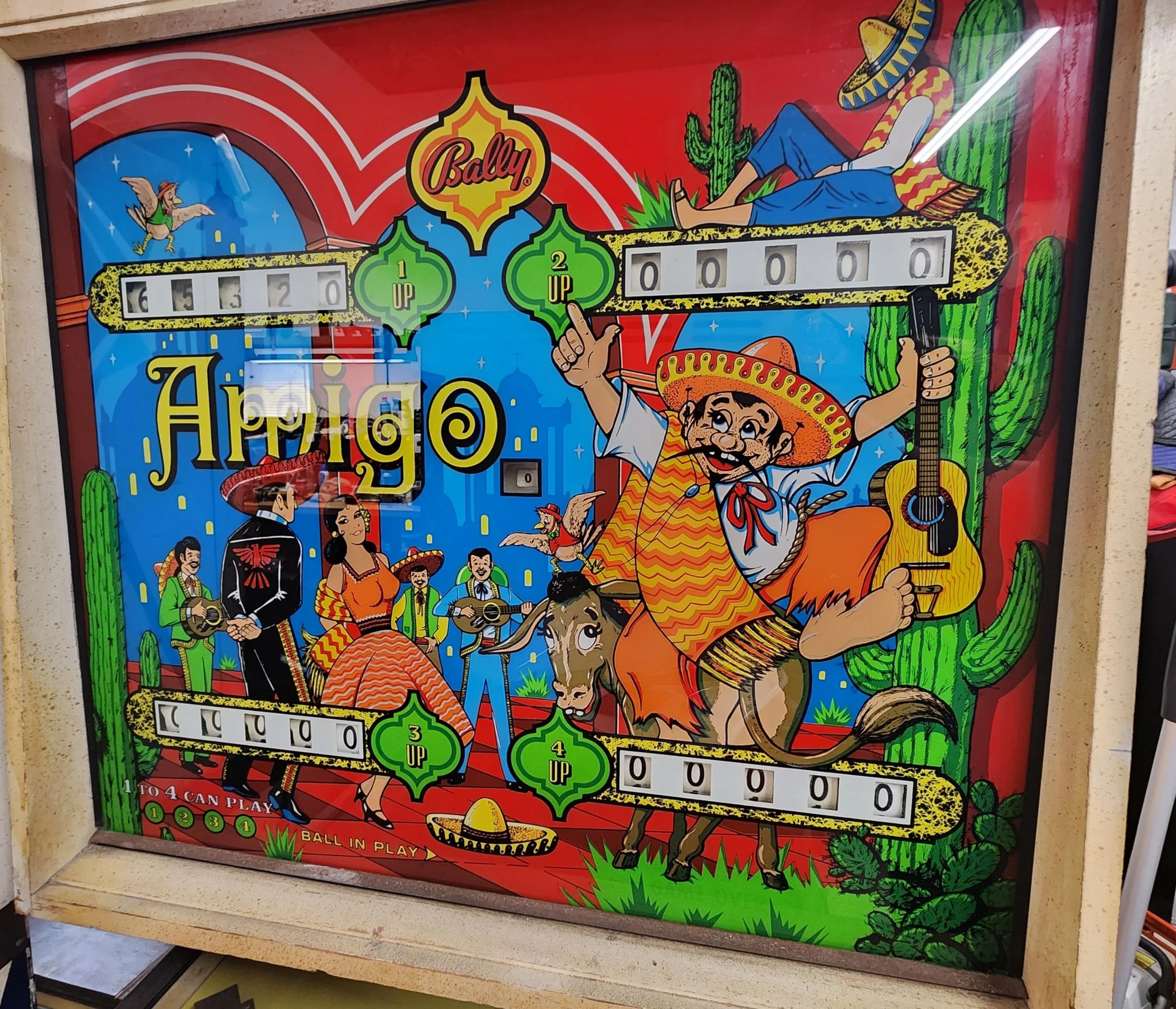 Pinball art of a man wearing a sombrero and traditional charro outfit, standing with hands behind his back, on a decorated wooden surface.
