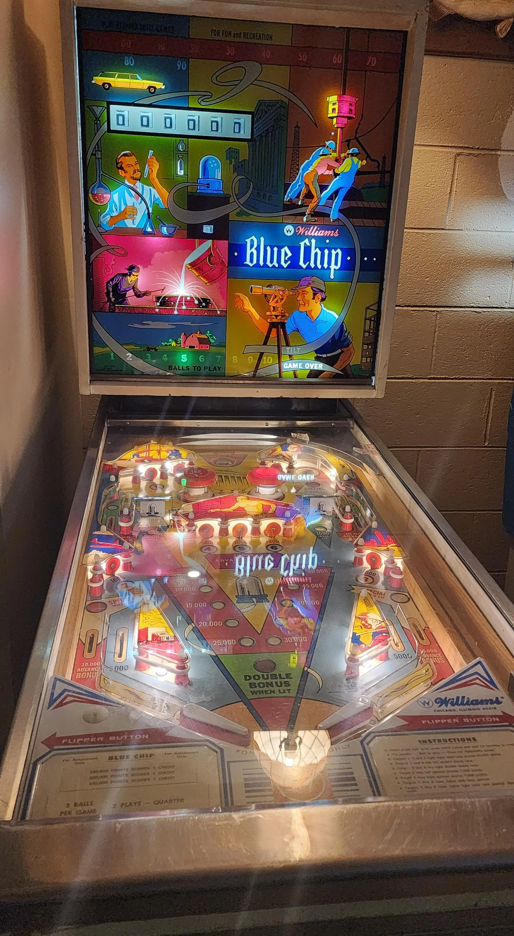 A vintage Williams Blue Chip pinball machine with a colorful backglass art featuring scenes of science, engineering, and outdoor activities. The playfield shows bumpers, targets, and flippers, with the game in active play.