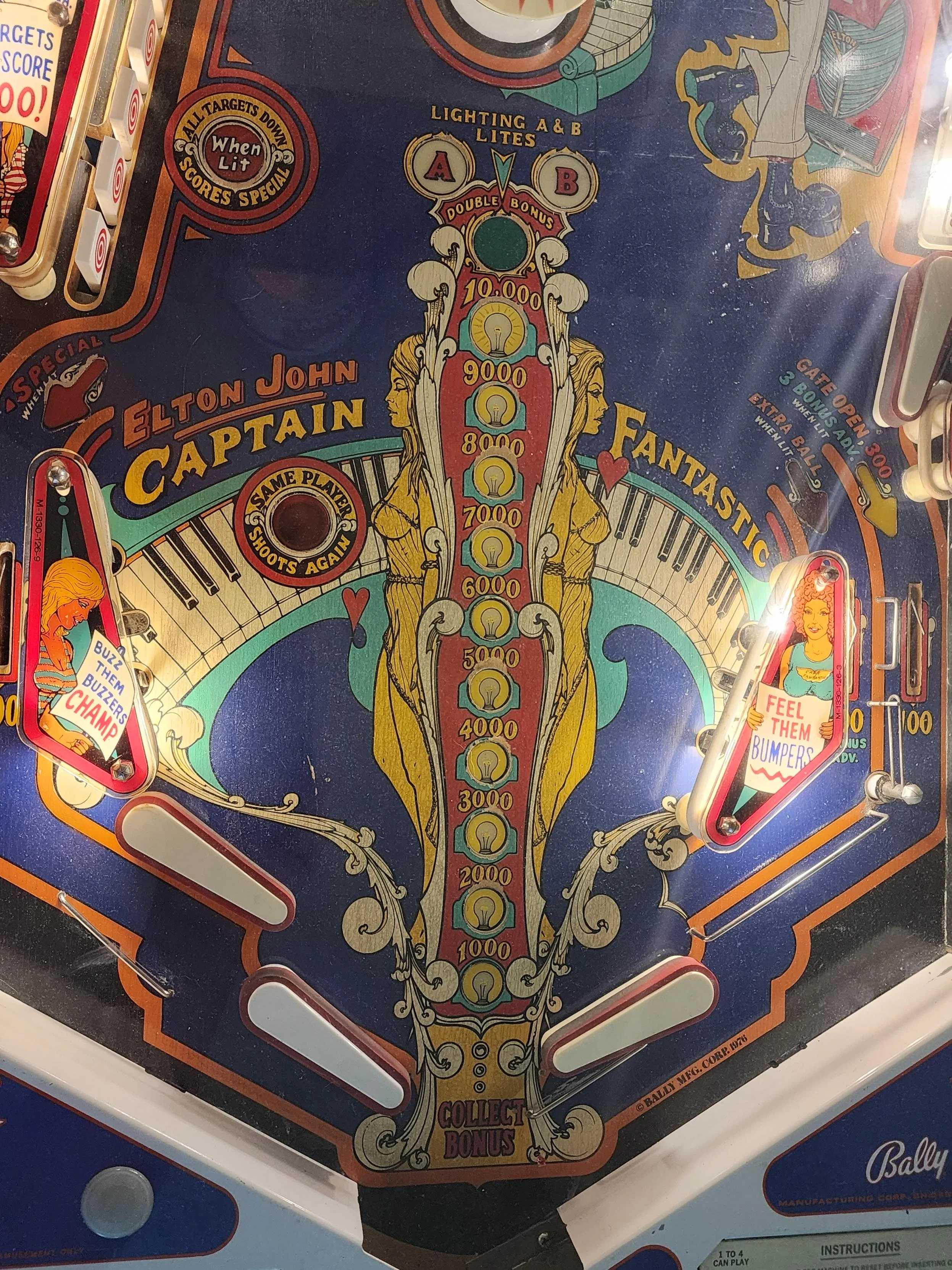 Close-up of a vintage Elton John Captain Fantastic pinball machine playfield, featuring colorful artwork, bumpers, and scoring targets.