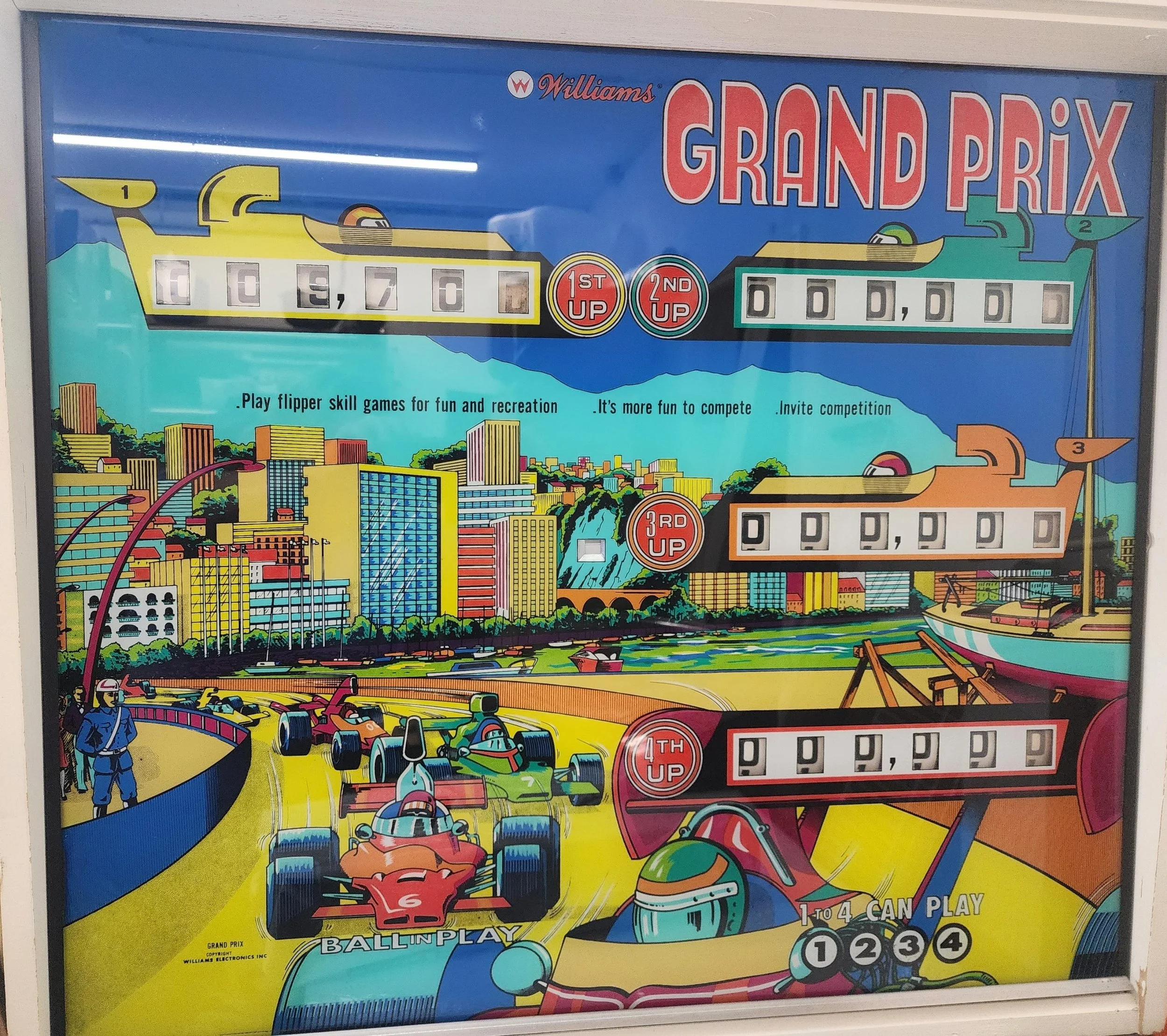 Arcade race car game with four prize slots and a cityscape background at the Grand Prix event.