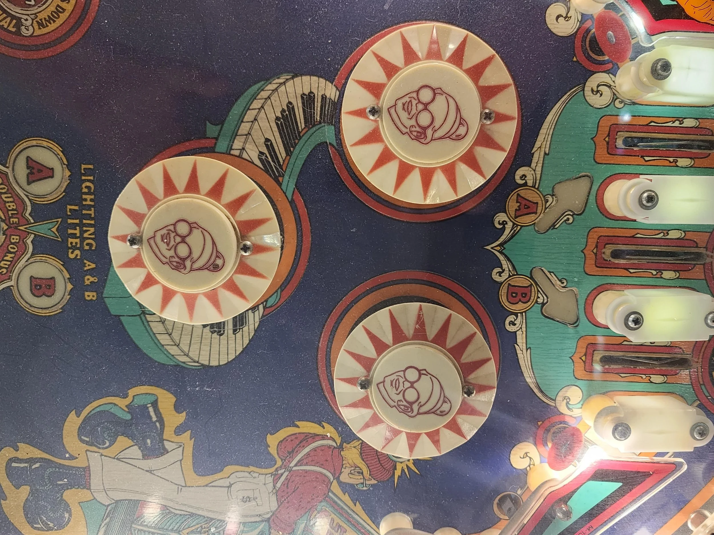 Close-up of a vintage pinball machine with illuminated bumpers featuring Clown with glasses. The playfield includes colorful artwork and lights.