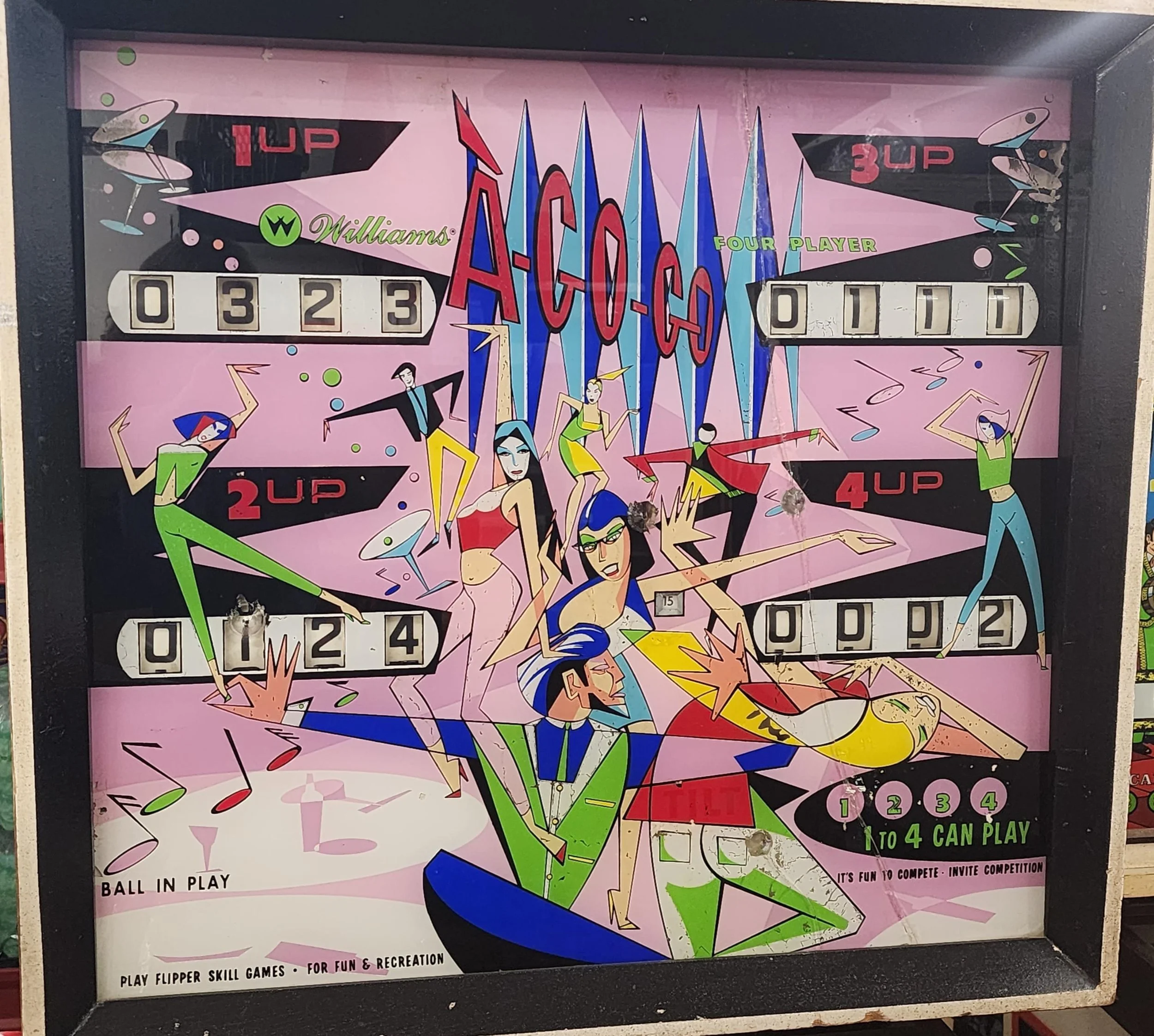 A colorful pinball machine featuring stylized illustrations of dancers and musicians with the title 'A-GO-GO' at the top, score displays, and instructions at the bottom for playing.